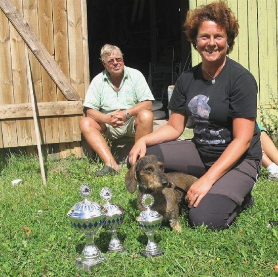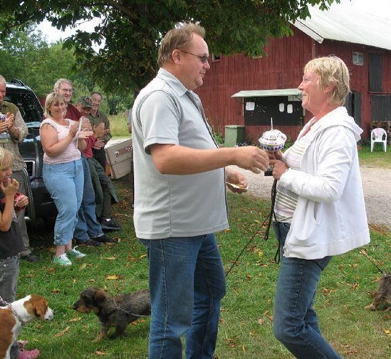 Även Ellensborg's Saffran fixade en tredje 1:a och blev SVENSK VILTSPÅRCHAMPION. Här med viltspårdomaren, Rosmarie Eklund.